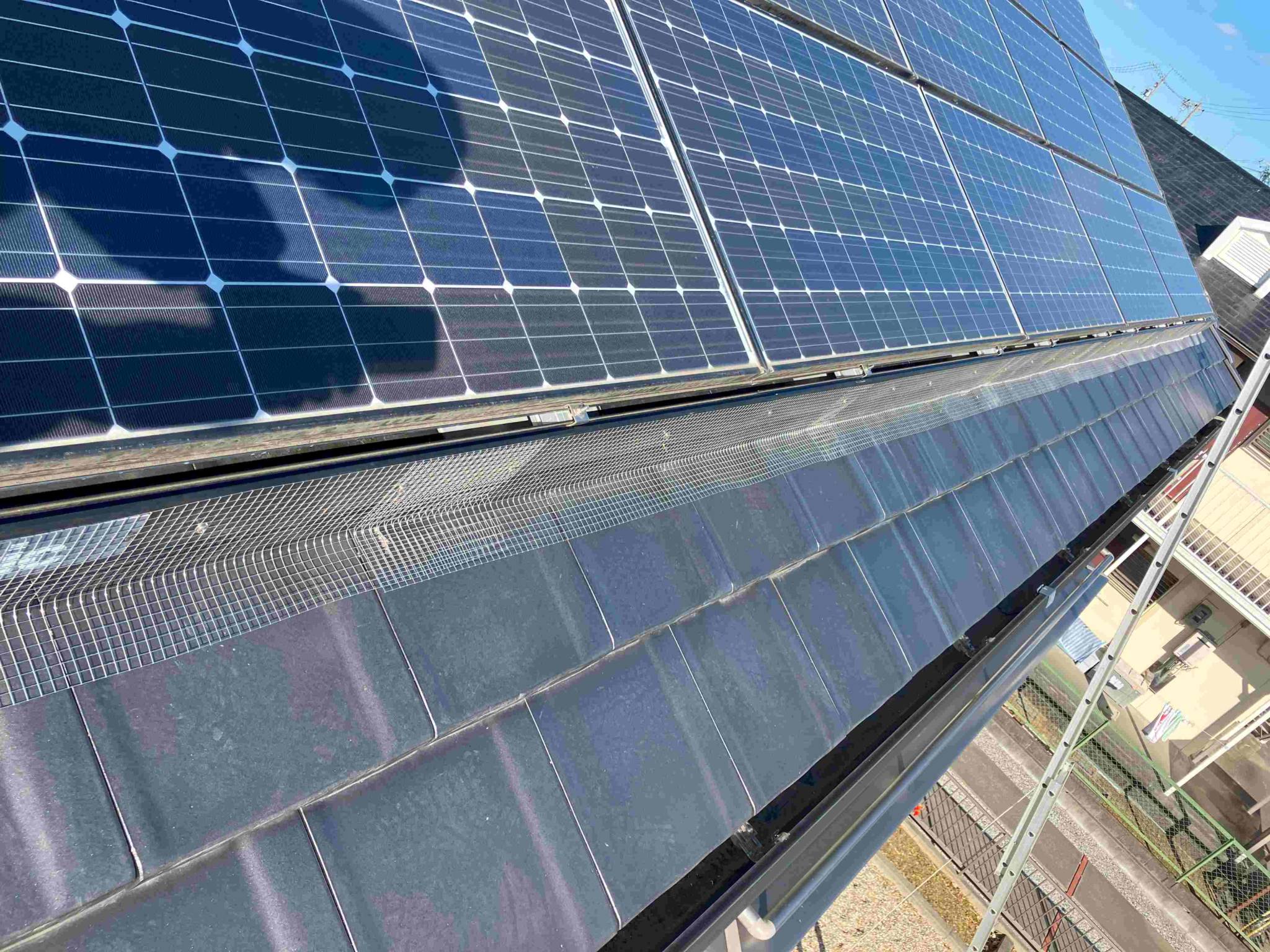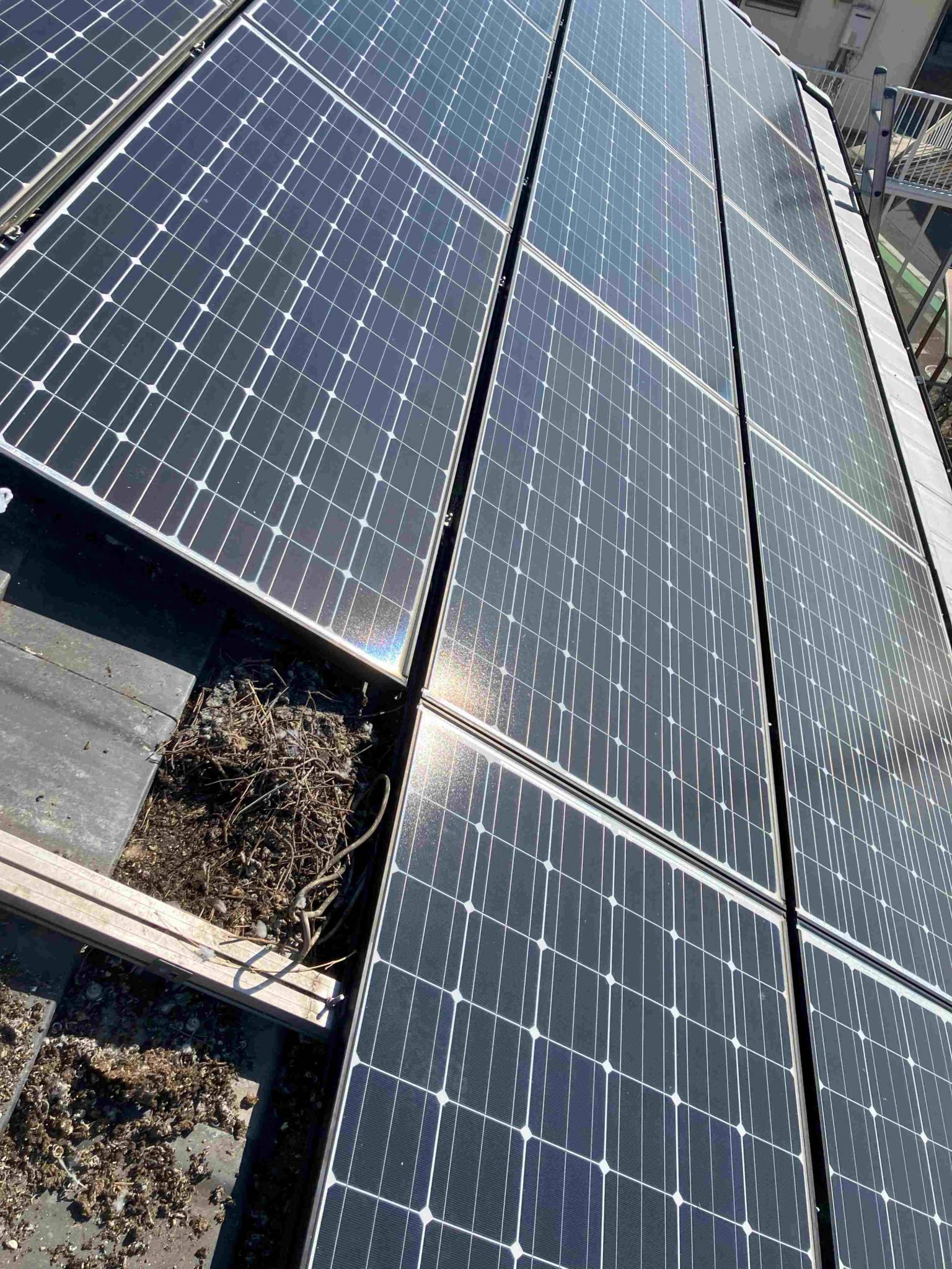 太陽光パネル防鳥フェンス工事 バードブロッカー 太陽光パネルの下に鳥が巣を作り、卵がベランダに落ちてきたと相談を受けてステンレス製の防鳥フェンスで鳥が入れないように工事をしました。約50件の施工実績がありますのでお任せください。安易に安いプラスチック製のフェンスで工事をすると5年持たずにフェンスが破れてしまうので20年以上長持ちするステンレス製のフェンスをお奨め致します